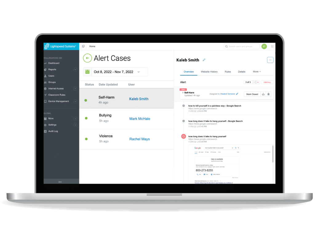 Lightspeed Alert is an at-risk student identification solution that monitors and analyzes online activity for signs of self-harm, violence, and bullying. Students often confide in their devices in ways they may not be willing or able to in person. Looking for warning signs in online activity identifies students in need of help who might otherwise go unseen. By allowing staff to focus efforts on early intervention, Lightspeed Alert empowers schools to have proactive student safety measures.